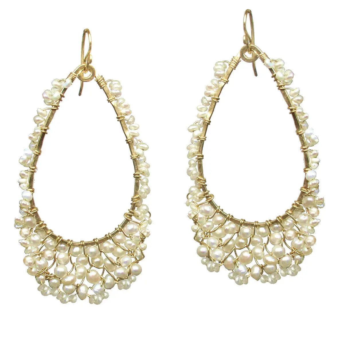 Bonnie Ricondo, artist-designer of Calico Juno Designs, has handcrafted these earrings with ivory pearls wrapped on hammered drops. They are available in 14k yellow gold fill, 14k rose gold fill, or sterling silver. Shown in 14K gold fill.