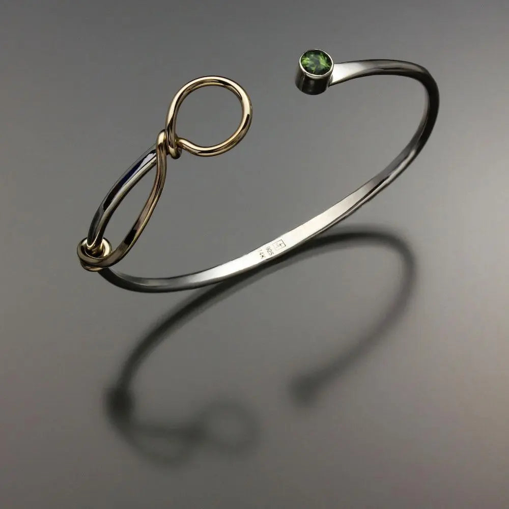 John Tzelepis handcrafts this Sterling Silver and 14Kt Gold Peridot Bracelet. This piece has a minimal sculptural feel. It has a 5mm gemstone.