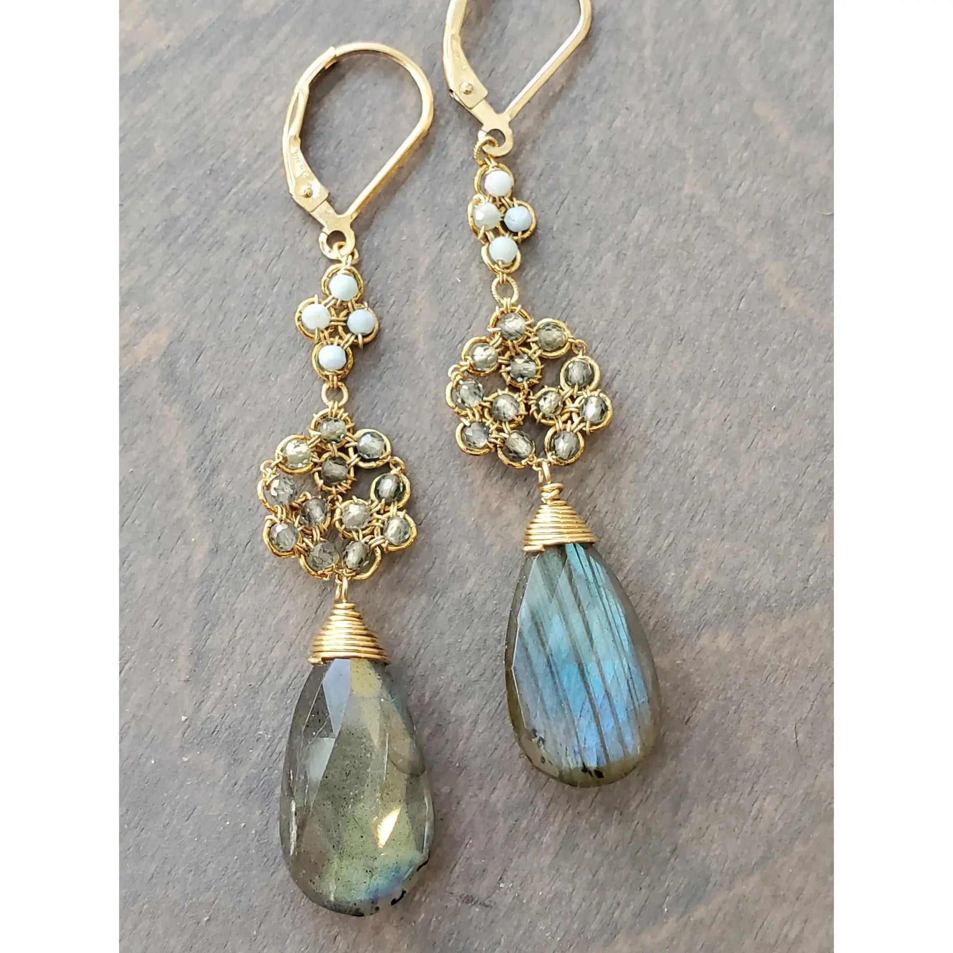 Honeycomb Earrings with Larimar and Australian Sapphire Wired Beads, Faceted Labradorite Drops