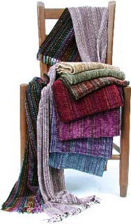 Trillium Handmade Weavers' chenille scarves are made from high-gloss rayon chenille yarn, chosen for its color brilliance and soft feel. The cloth is cozy, lustrous, and smooth, composed from a palette of more than fifty yarn colors, dyed to Trillium Handmade Weavers specifications. In the finished fabric the colors blend, softening the warp stripes. The drape is relaxed and very comfortable. These chenille scarves are woven on multi-color warps (lengthwise threads), with a solid weft (back-and-forth thread).